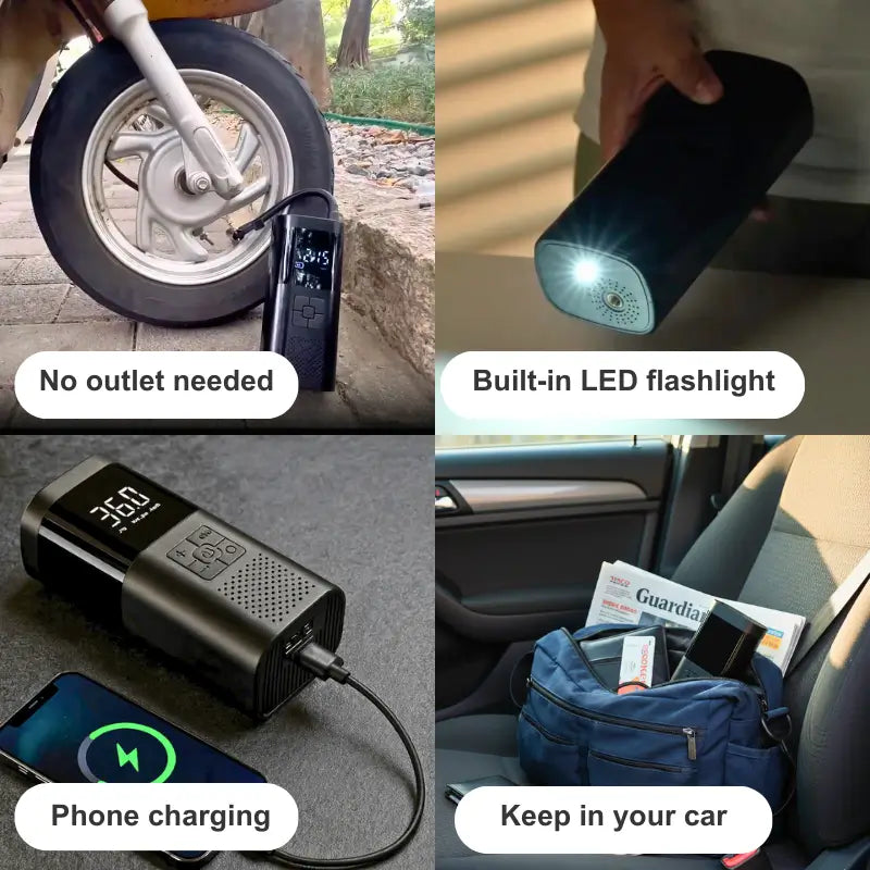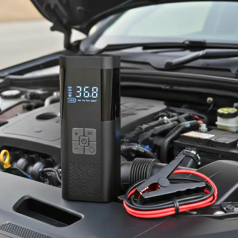 4-in-1 Multi-Function Device – A compact and powerful unit that works as a Jump Starter, Air Compressor, Power Bank, and LED Flashlight, perfect for emergencies and everyday use.