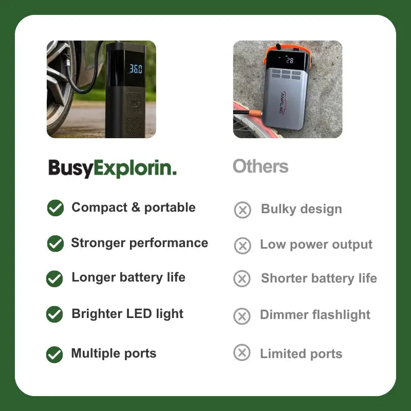 Looking for real peace of mind? Introducing the BusyExplorin™ PowerAir Max - your companion for all your trips. It's compact, reliable, and ready to get you back on the road fast, wherever adventure takes you.